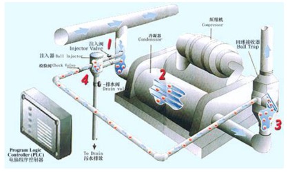 1、電腦程序控制器啟動清洗循環(huán),將注射閥門打開,控制特殊球進(jìn)入冷凝器循環(huán)系統(tǒng); 2、尺寸比管道稍大的軟質(zhì)材料制成的特殊球通過冷凝器,將冷凝器管壁上的水垢和污垢帶走; 3、特殊球通過冷凝器后,被回收器接收; 4、電腦程序控制器打開排水閥門,球自動回到球注入槽,槽中的水自動將特殊球進(jìn)行清洗、排污、排水閥門關(guān)閉,完成一次循環(huán)。遵此電腦程序每天進(jìn)行36次循環(huán)清洗。 |