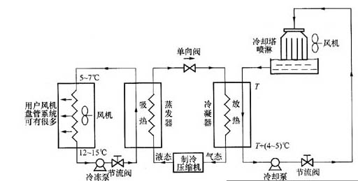 中央空調系統部分組成: 冷凍水循環系統 該部分由冷凍泵、室內風機及冷凍水管道等組成。從主機蒸發器流出的低溫冷凍水由冷凍泵加壓送入冷凍水管道(出水),進入室內進行熱交換,帶走房間內的熱量,最后回到主機蒸發器(回水)。室內風機用于將空氣吹過冷凍水管道,降低空氣溫度,加速室內熱交換。 冷卻水循環部分 該部分由冷卻泵、冷卻水管道、冷卻水塔及冷凝器等組成。冷凍水循環系統進行室內熱交換的同時,必將帶走室內大量的熱能。該熱能通過主機內的冷媒傳遞給冷卻水,使冷卻水溫度升高。冷卻泵將升溫后的冷卻水壓入冷卻水塔(出水),使之與大氣進行熱交換,降低溫度后再送回主機冷凝器(回水)。 主機 主機部分由壓縮機、蒸發器、冷凝器及冷媒(制冷劑)等組成,其工作循環過程如下: 首先低壓氣態冷媒被壓縮機加壓進入冷凝器并逐漸冷凝成高壓液體。在冷凝過程中冷媒會釋放出大量熱能,這部分熱能被冷凝器中的冷卻水吸收并送到室外的冷卻塔上,最終釋放到大氣中去。隨后冷凝器中的高壓液態冷媒在流經蒸發器前的節流降壓裝置時,因為壓力的突變而氣化,形成氣液混合物進入蒸發器。冷媒在蒸發器中不斷氣化,同時會吸收冷凍水中的熱量使其達到較低溫度。最后,蒸發器中氣化后的冷媒又變成了低壓氣體,重新進入了壓縮機,如此循環往復。 |